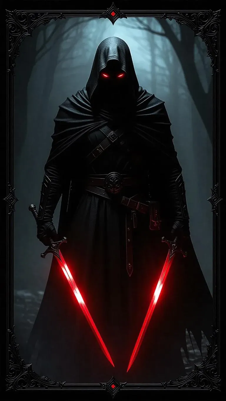 A mysterious cloaked figure stands vulnerable in shadow mist, wielding twin blades of void. His glowing crimson eyes pierce through the shadows. Isolated corners and menacing silhouettes form the background. The scene is bathed in a haunting, eerie light, enhancing the brooding atmosphere. The card features stealth-themed silver-on-black accents with sharp edges, adding a sharp, menacing edge. Style: Dark fantasy.