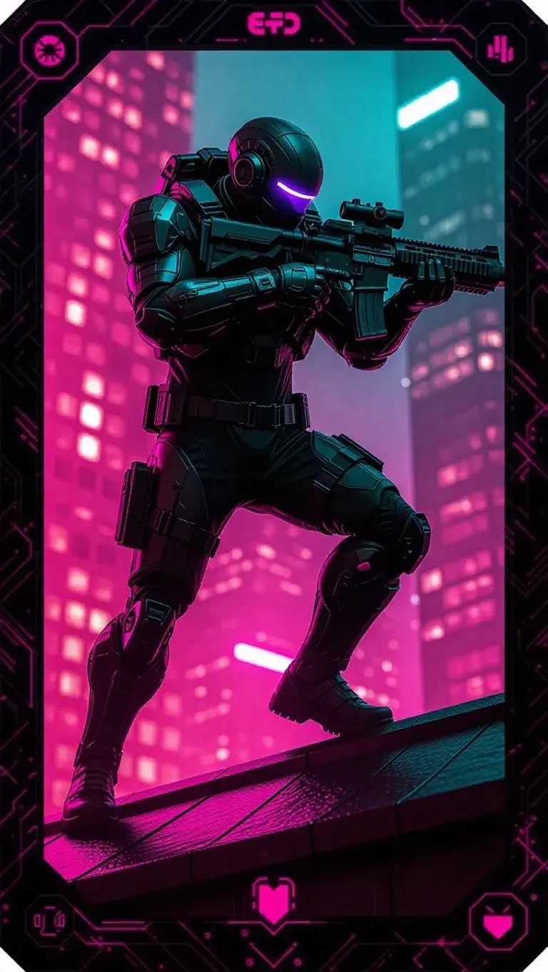 A cyberpunk assassin balances on a misty rooftop, clad in a dark green armor suit and brandishing a heavy plasma cannon. His violet cyber-eye gleams brightly. The collectible card features a chrome silver border with digital noise effects, a legendary-class icon, and red-pink holographic lighting, showcasing the high-tech motif.