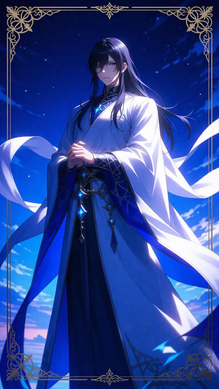 A tranquil anime-style male guardian, adorned in flowing silver robes with intricate rune patterns, stands in a vigilant pose. His long dark-haired glimmers softly, and his pale blue eyes exude serenity. The background features a clear night sky illuminated by stars. The scene is framed by an elegant golden border with protective symbols and a shimmering effect.