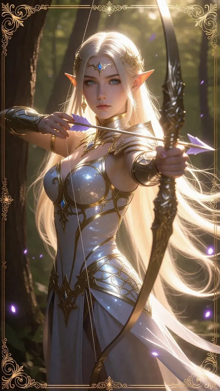 A graceful elven archer queen with gleaming silver eyes and flowing golden hair stands in a secluded glen. She wears moon-patterned enchanted armor and holds a glowing bow made of celestial light. The scene is adorned with glen runes, drifting starlight, and an ornate ivory border featuring heavenly glyphs. Soft lavender and gold holographic light shimmers around her, casting a mystical glow.