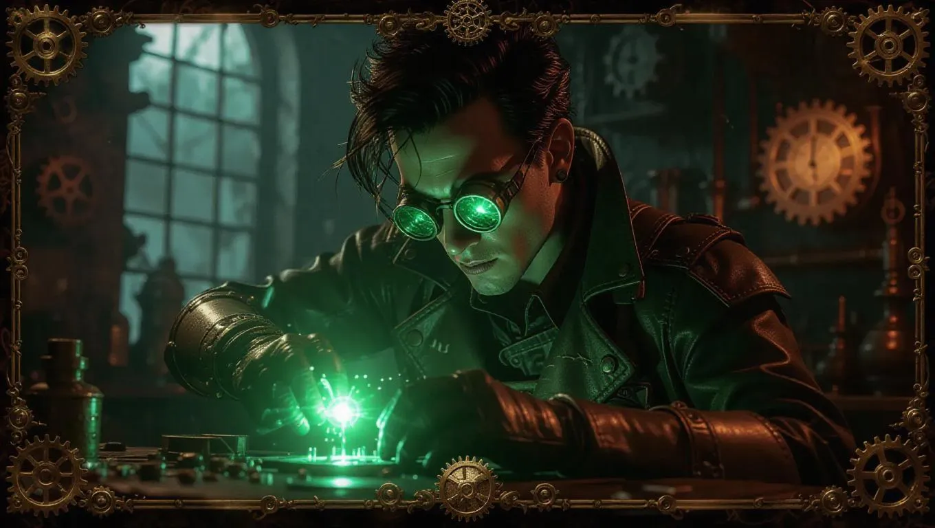 A clockwork engineer with messy copper hair and a green aura tinkers with gadgets in dark energy. His goggles shine as energy nuts and bolts fly around him. The scene is set against a steampunk backdrop, with gears and cogs turning in the background. The card is framed with metallic bronze borders, adorned with gear icons and tool emblems, creating a high-quality SSR engineer card effect. The lighting is warm and industrial, casting soft highlights and emphasizing the inventive action. The style is a blend of steampunk and science fiction aesthetics.
