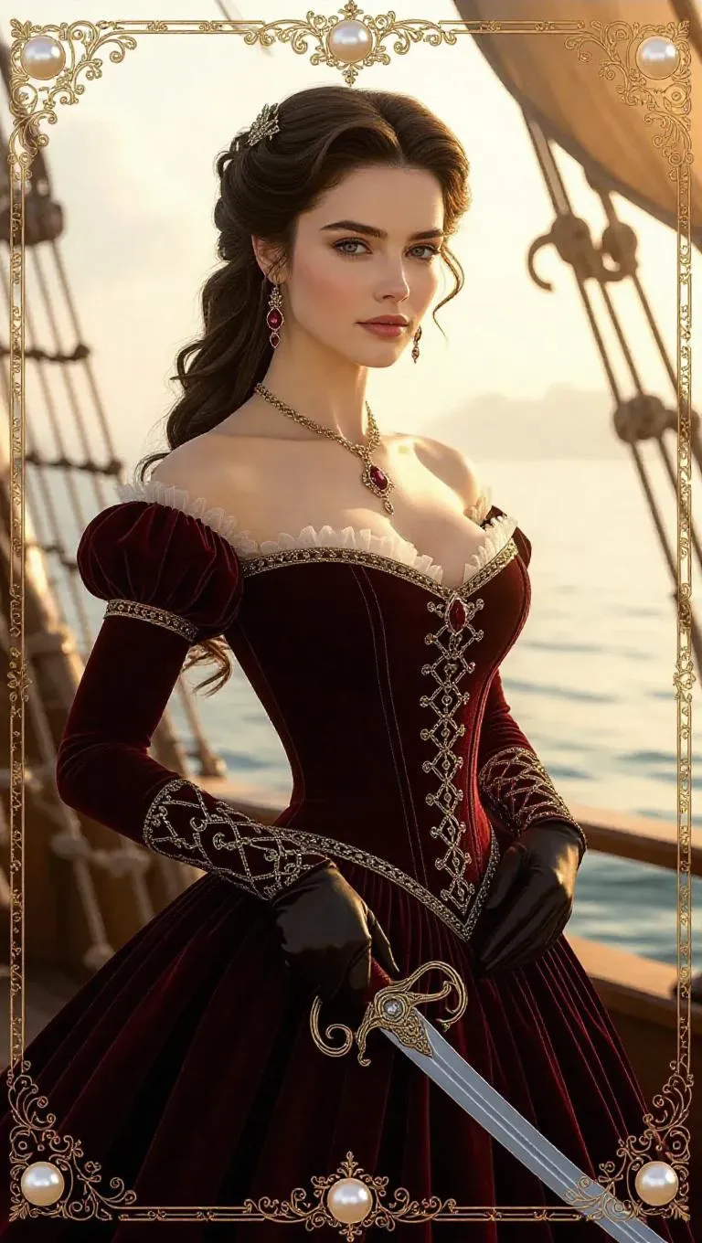 A regal pirate queen with elegant updo, dressed in a lavish gown and jeweled corset, radiating majesty and grace. She proudly showcases a bejeweled sword while standing on the polished deck of her grand ship, with calm waters and a serene sky enhancing the ethereal atmosphere. The card border features intricate sea creature designs, adorned with rose gold and ivory decorations, complemented by radiant white pearls.
