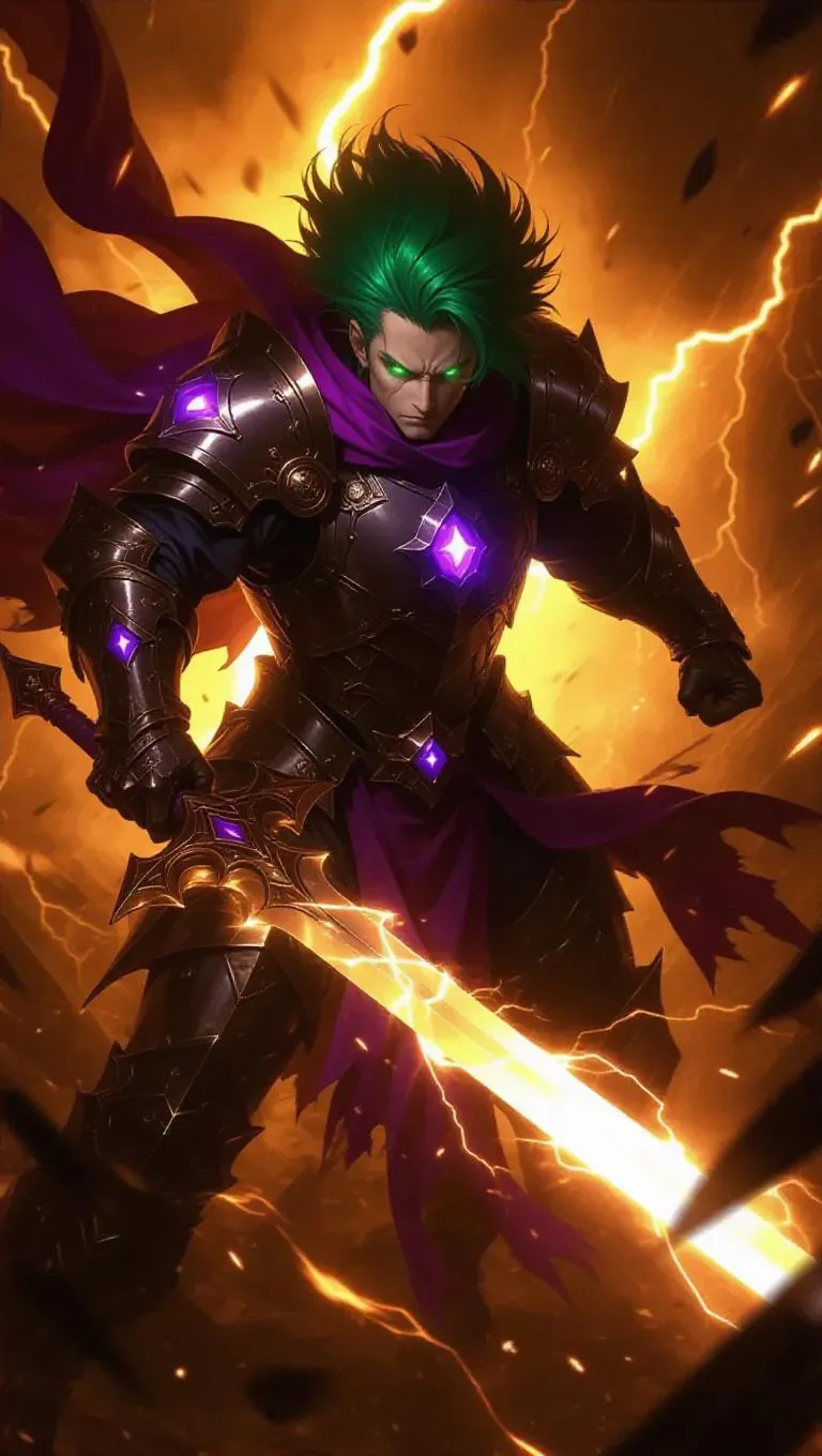 A fierce warrior with wild green hair and a purple aura charges through dark energy. His armor clinks loudly as energy waves crash around him. The scene is set against a raging storm, with thunder rumbling in the background. The card is framed with matte black borders, adorned with storm icons and electric spear emblems, creating a high-quality SSR warrior card effect. The lighting is stark and contrast-heavy, casting deep shadows and highlighting the chaotic action. The style is a blend of post-apocalyptic and dark fantasy aesthetics.