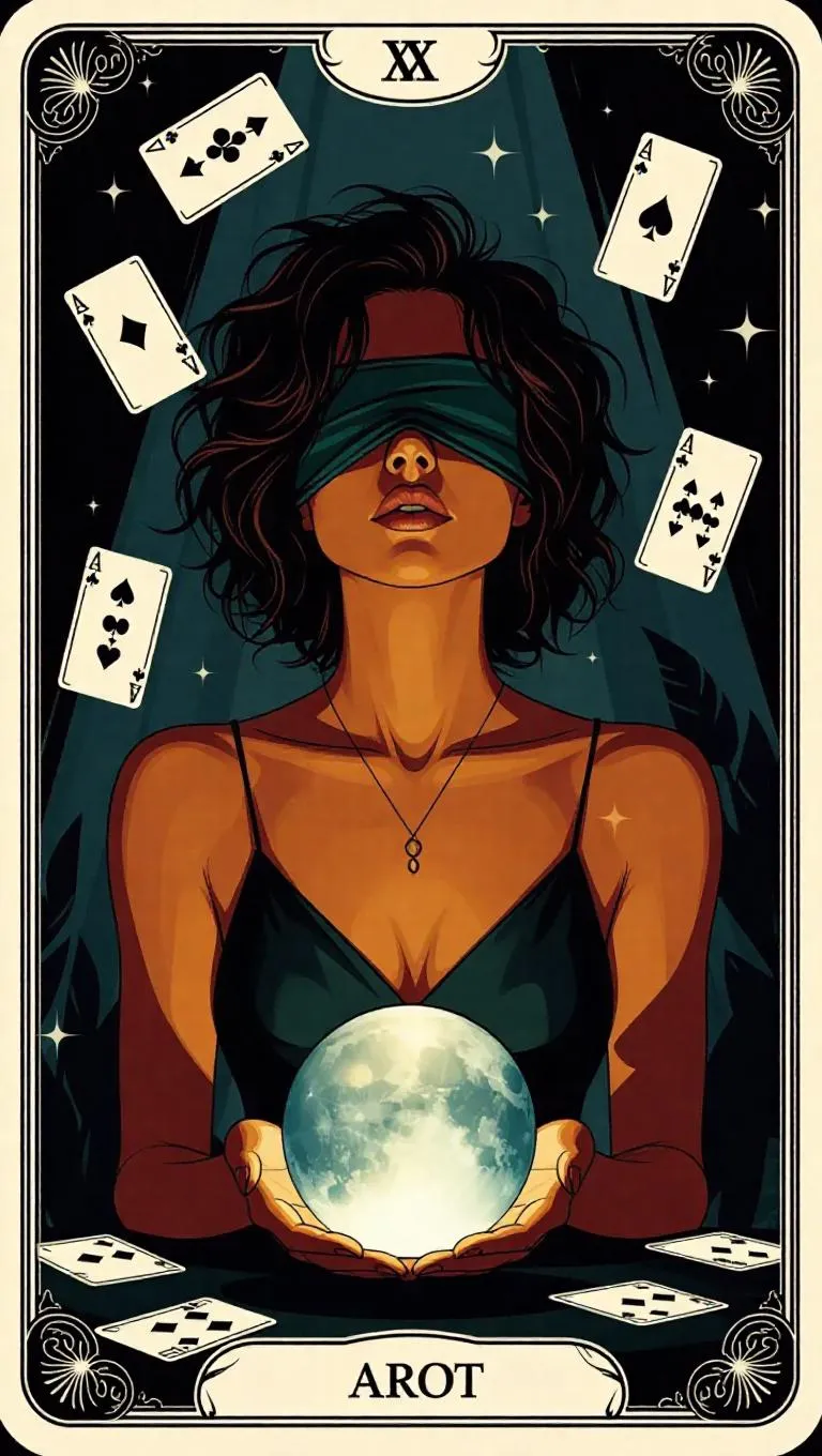 A tarot-themed card depicts a blindfolded fortune-teller with a dim crystal ball, surrounded by fluttering tarot cards. The fortune-teller wears a casual, modern dress and has messy, tousled hair. Her expression is contemplative and thoughtful. The scene is mysterious and abstract, with a muted, shadowy glow. The card border features minimalist designs and Contemporary Art-inspired accents, adding a fresh touch. Soft, ambient light bathes the scene, enhancing the introspective atmosphere. Style: Contemporary, Abstract.