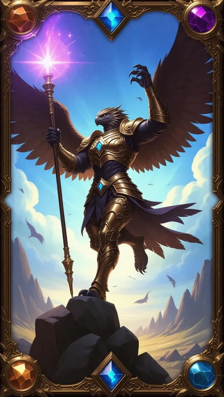 A mythical griffin warrior lands on the battlefield, wings spread wide, and a staff glowing with ancient wisdom. His bronze armor shines under the light, and the background portrays a mystical sky. The game card features an ancient-themed border with elemental stones, platinum foil textures, and a radiant arcane glow.