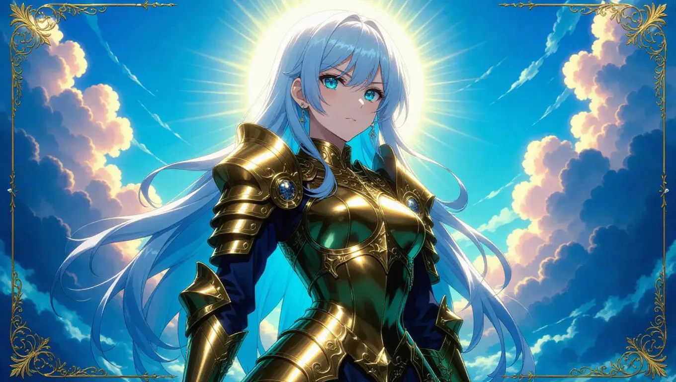 A fierce anime-style female knight, clad in gleaming gold armor with intricate engravings, stands in a poised pose. Her long silver hair glistens, and her turquoise eyes gleam with determination. The background features a dawn sun casting soft rays, surrounded by colorful clouds. The card border is radiant, with radiant patterns, divine symbols, and a holographic finish, accented by golden vines and shining pearls.