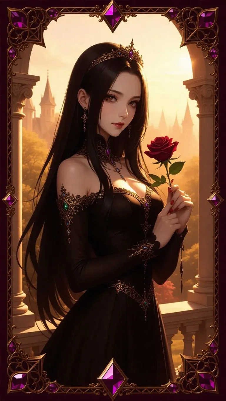 A mysterious queen with long, straight black hair, wearing a regal gown with beading, holds a black rose while standing on a charming balcony overlooking a sunlit afternoon sky. The background showcases a vibrant, enchanted forest with radiant crystals. The card border features bold geometric and star motifs, accented with maroon and gold decorations, and adorned with sparkling onyx.