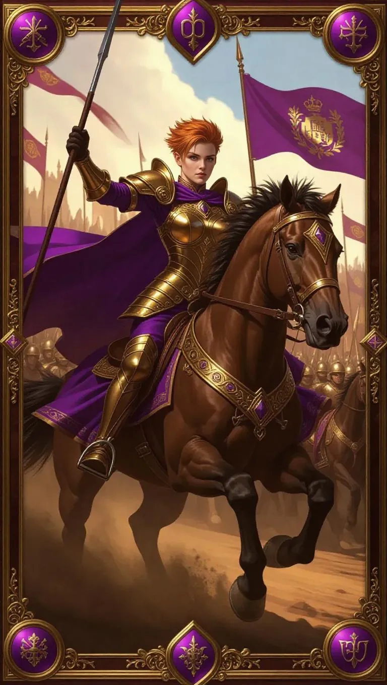 A valiant female warrior princess with short, spiky red hair and fierce, determined orange eyes, armored in a magnificent suit of golden armor with royal purple accents and a flowing cape. She rides a majestic warhorse, charging into battle with a lance held high. The background is a vast battlefield with flags waving and soldiers clashing, encased in an opulent gold border with royal crests and heraldic symbols. Bold lighting, dynamic shadows, and a heroic, powerful aura create a grand masterpiece in the style of collectible card games.