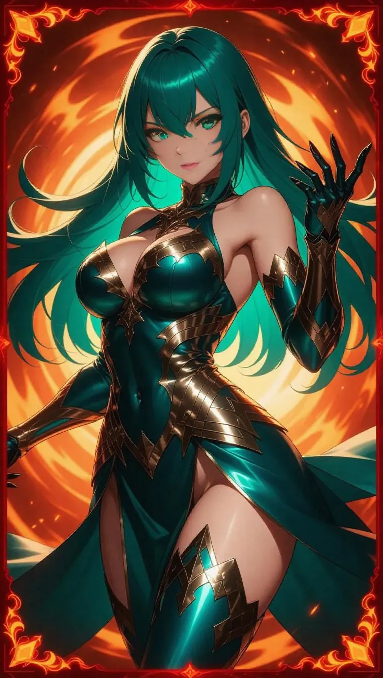 A fierce anime-style female sorceress, clad in a shiny silver and teal outfit adorned with intricate flame-like patterns, strikes a commanding pose. Her long teal hair cascades like liquid fire, and her glowing teal eyes blaze with intense determination. The background is a swirling inferno with radiant embers, framed by a fiery red border with holographic flame motifs.