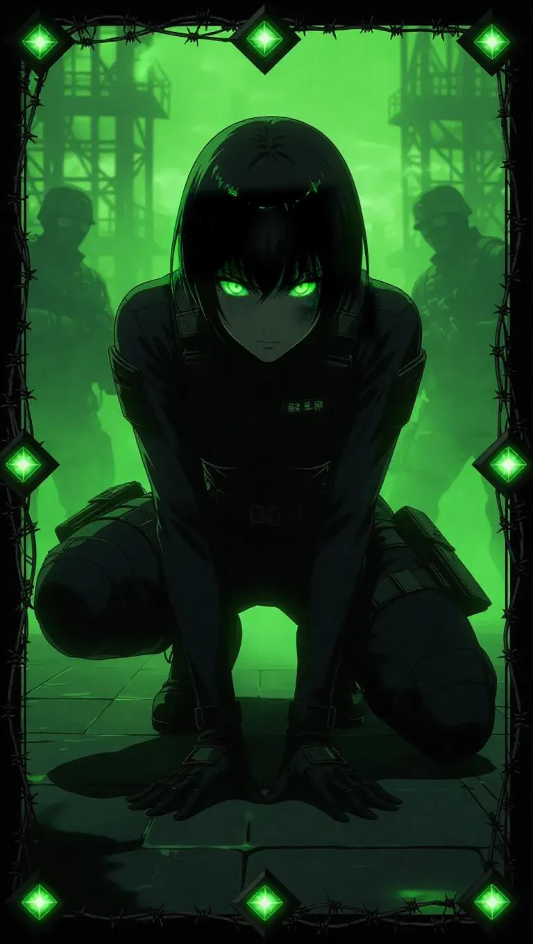 A mysterious anime-style female assassin, dressed in tactical black outfit with glowing chartreuse accents, crouches in a stealthy pose. Her short, cropped dark hair contrasts with her glowing lime eyes. The background features a military base with swirling green mist and shadowy figures. The card border is utilitarian, adorned with harsh black lines, glowing chartreuse runes, and a matte finish, framed by barbed wire and embedded peridot stones.
