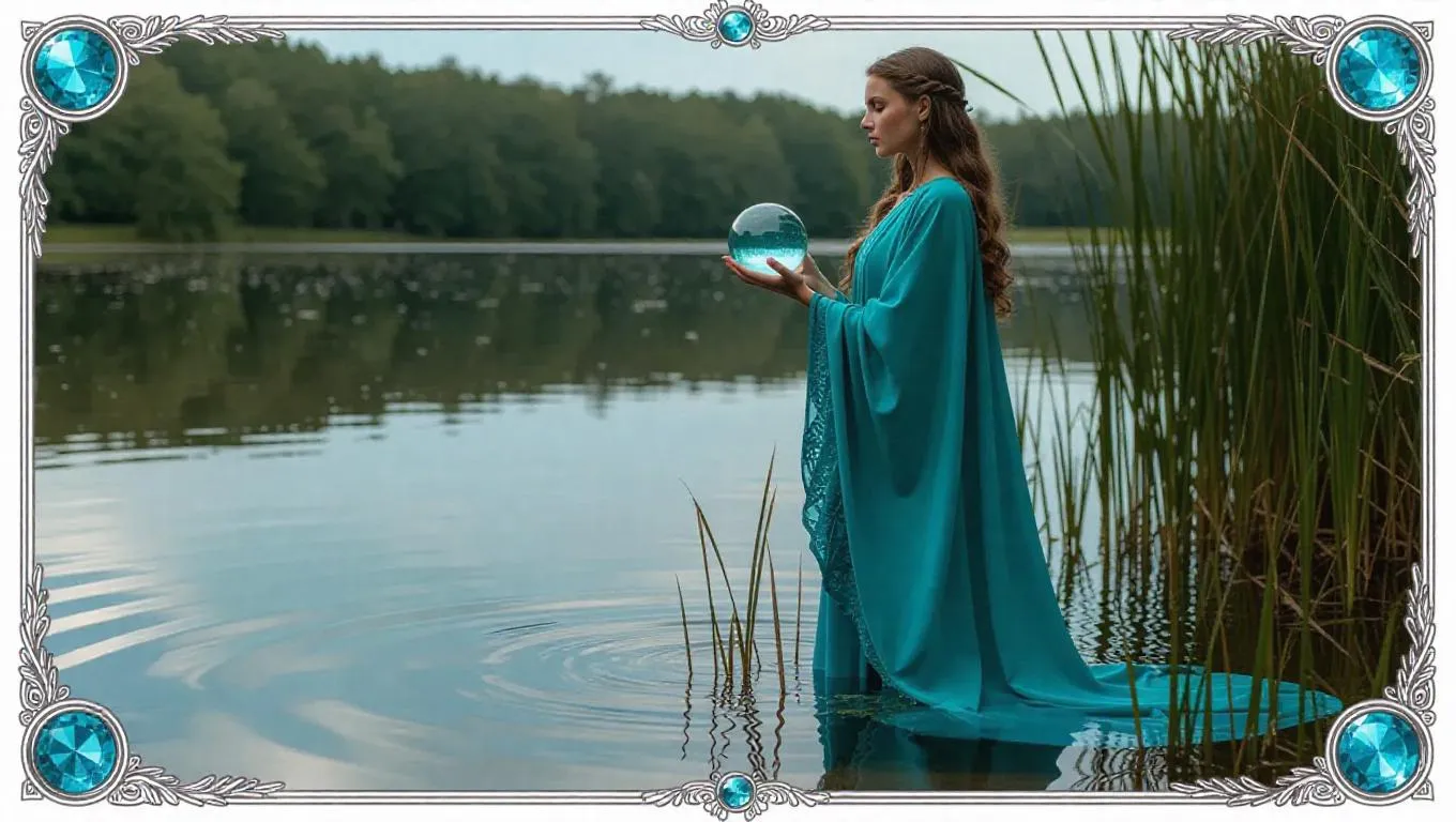 A tranquil sorceress with soft hazel eyes, draped in a flowing turquoise robe and barefoot, holds a glowing crystal orb while standing beside a serene lake. Gentle ripples and swaying reeds create a calming ambiance. The card border features fish and wave motifs, accented with teal and silver decorations, and adorned with aquamarine.