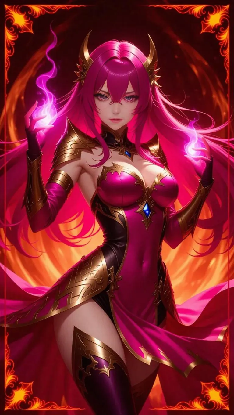 A fierce anime-style female sorceress, clad in a mystical pink and gold outfit adorned with intricate flame-like patterns, strikes a commanding pose. Her long fuchsia hair cascades like liquid fire, and her glowing lilac eyes blaze with intense determination. The background is a swirling inferno with radiant embers, framed by a fiery red border with holographic flame motifs.