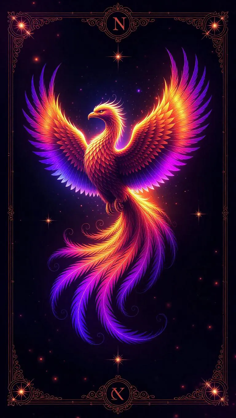 A celestial phoenix rises from stardust, its aura ablaze with nebula flames. Supernovas and orbiting stars fill the card background, while the frame shines with radiant galaxy colors and aurora effects, adorned with twinkling runes. Soft, luminescent light illuminates the phoenix, casting a glow that highlights the intricate details of its plumage. The style is otherworldly and ethereal, blending realism with cosmic elements.