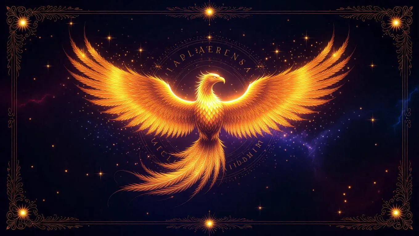 A celestial phoenix rises from stardust, its essence ablaze with nebula flames. Supernovas and sparkling comets fill the card background, while the frame shimmers with twilight galaxy colors and aurora effects, adorned with starry runes. Soft, golden light illuminates the phoenix, casting a glow that highlights the intricate details of its wings. The style is celestial and whimsical, blending realism with cosmic elements.