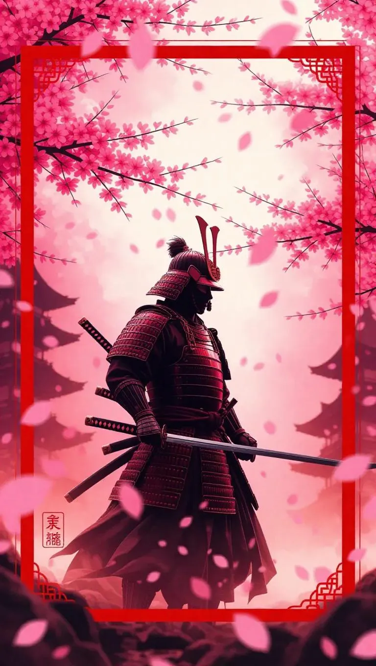 A samurai spirit stands amidst a flurry of falling cherry blossoms, his katana radiating an ethereal, ancestral energy. The scene is framed by a modern graphic novel border adorned with red seals and bold ink strokes. Soft, warm light filters through the blossoms, casting a vibrant, nostalgic glow. The style is a blend of traditional Japanese art and contemporary pop art.