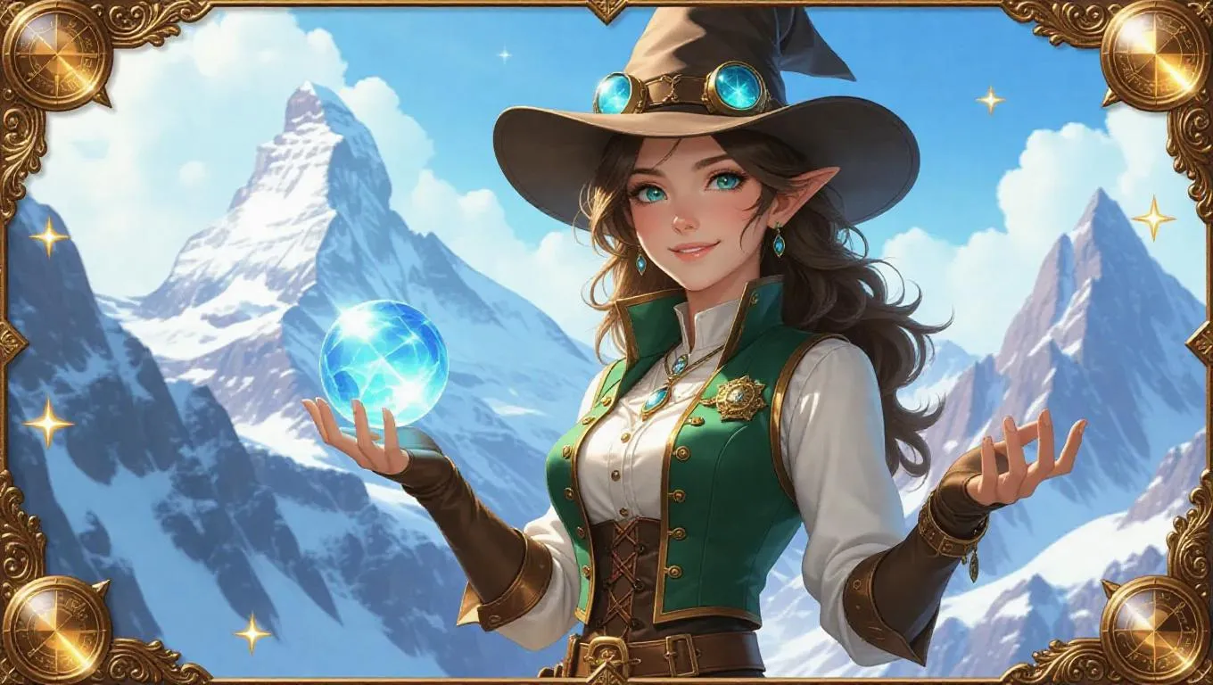 An adventurous sorceress with vibrant teal eyes, dressed in an explorer's outfit with a vest and hat, holds a glowing crystal orb while standing in a rugged mountain range. Snow-capped peaks and clear skies create an awe-inspiring ambiance. The card border features mountain and compass motifs, accented with earth tones, and adorned with citrine.