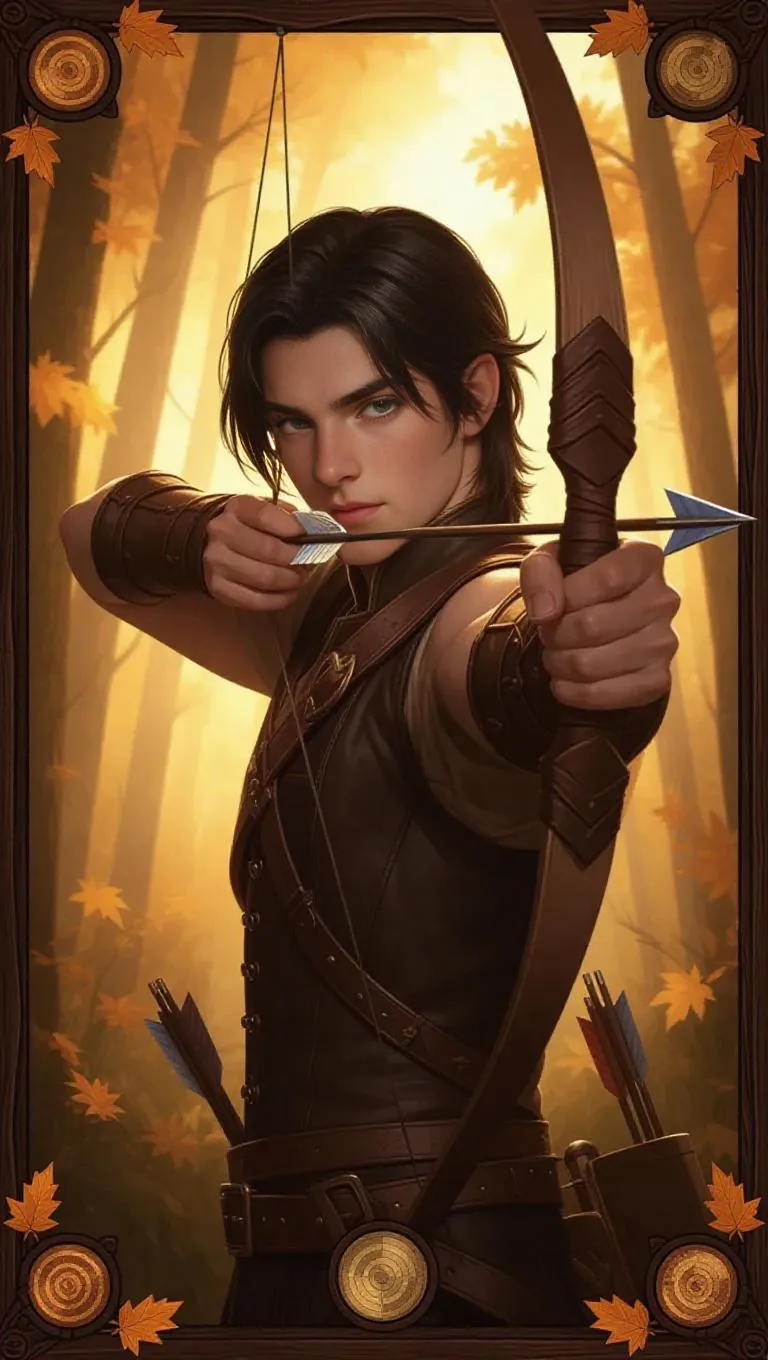 A youthful male archer with coal black hair and sharp, focused hazel eyes, clad in a brown leather outfit with a quiver of arrows and a powerful recurve bow. He takes aim, and a magical arrow with a glowing tip is poised for release. The dense forest background features vibrant autumn leaves and chirping birds, framed by a rustic wooden border adorned with leaf patterns and archery targets, exuding a natural, earthy texture. Soft lighting, subtle glows, and a sense of adventure create a captivating collectible card game-style image.