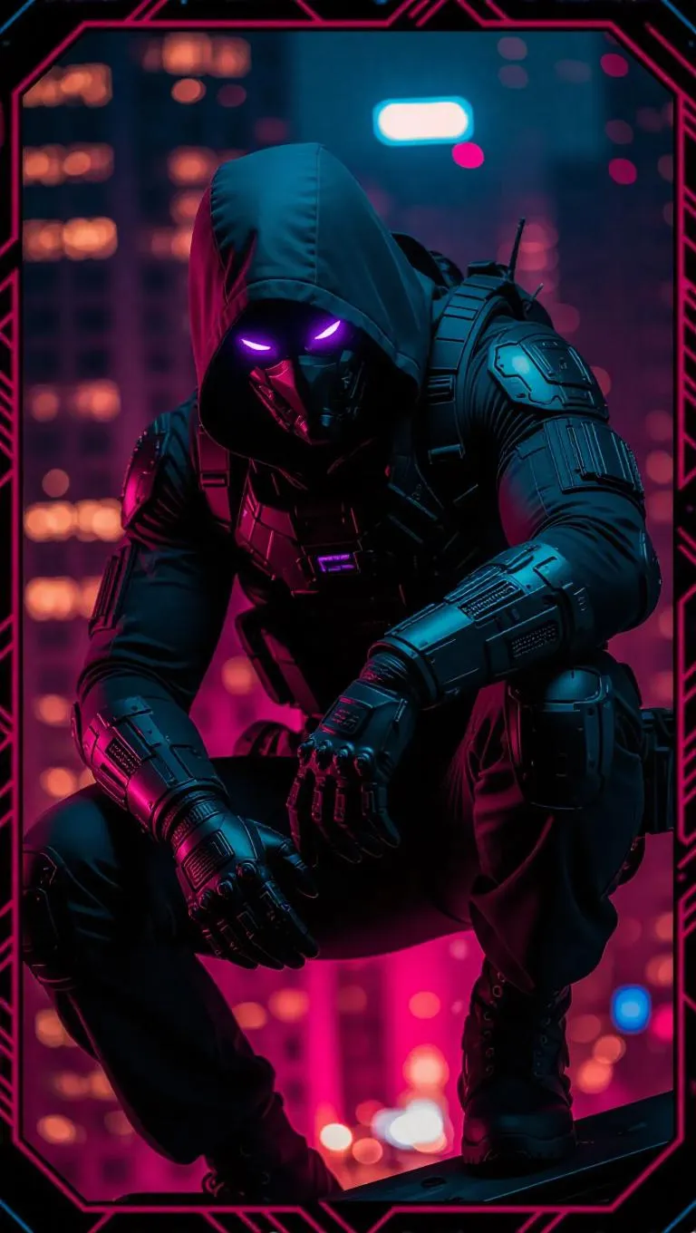 A cyberpunk assassin leans on the edge of a rooftop, attired in a teal combat suit and holding a plasma gauntlet. His lavender cyber-eye glows softly. The collectible card features a vivid red border with glitch lines, a common-class icon, and blue-purple holographic lighting, accentuating the futuristic design.