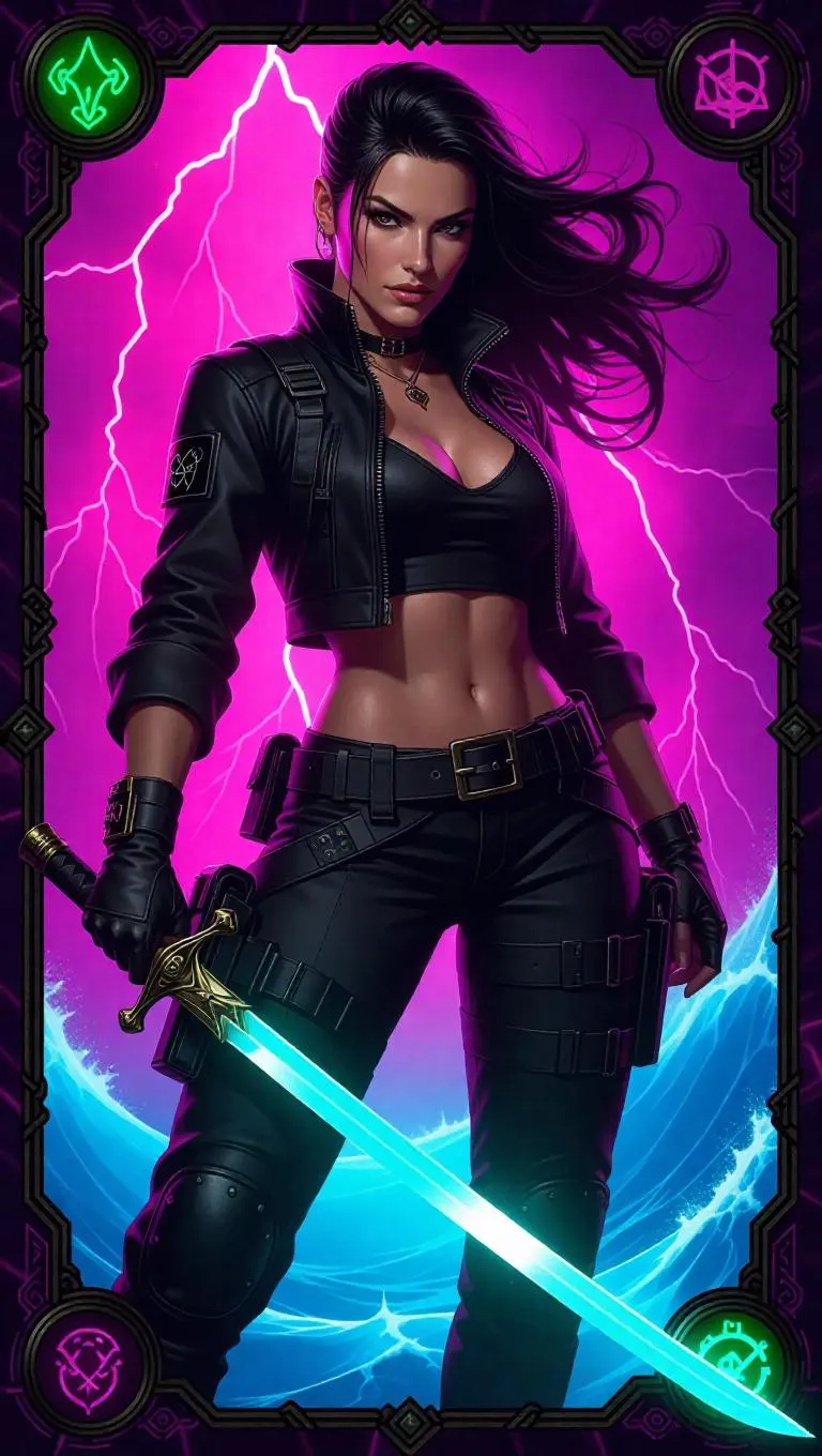 A dynamic pirate captain with slicked-back hair, wearing a modern tactical jacket and cargo pants, projecting confidence and boldness. She holds a futuristic sword while standing aboard her sleek ship, with chaotic waters and dazzling lightning enhancing an electric atmosphere. The card border displays high-tech gear and nautical symbols, highlighted with chrome and deep green elements, and enhanced with vibrant neon accents.