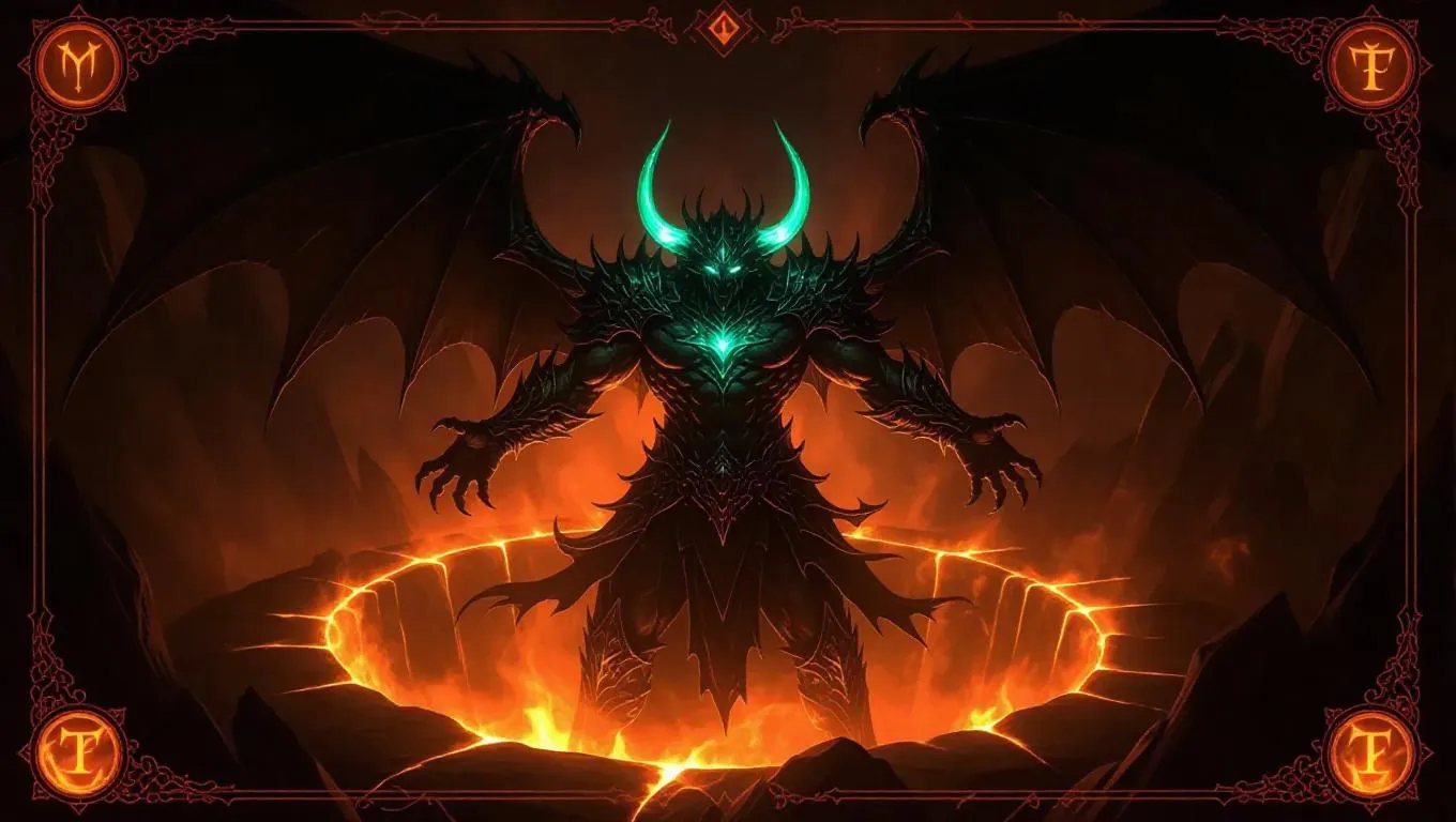 A shadowy demon lord descends from a pit of darkness, his mighty wings unfurling, bright green horns flickering, and glowing silver cracks tracing his muscled form. Hellfire and chaos enclose him, with cursed runes and a dark obsidian border embellished with fiery cracks framing the scene. An ancient card emblem in the corner amplifies the surreal energy. Holographic lighting and rich shadows accentuate the stunning card effect.