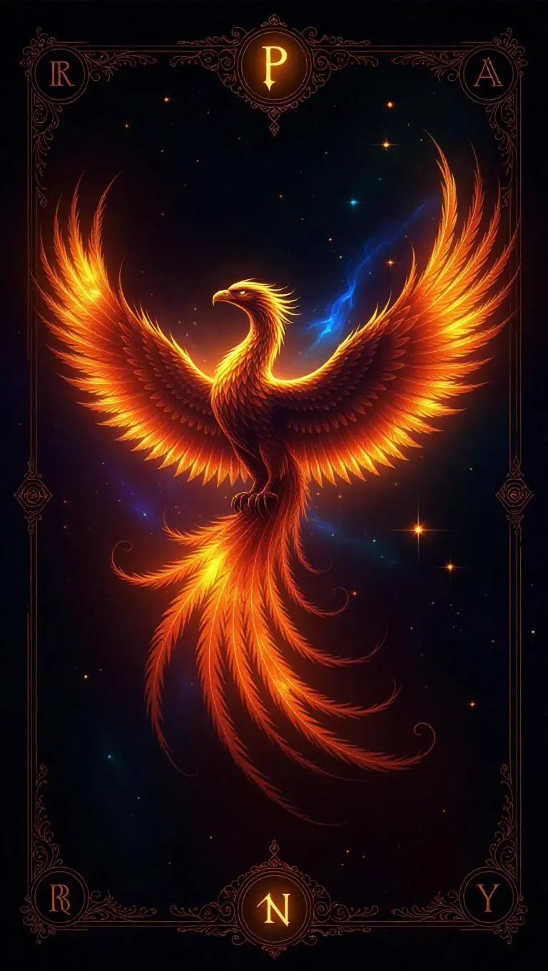 A celestial phoenix rises from stardust, its wings ablaze with nebula flames. Supernovas and swirling clouds fill the card background, while the frame shimmers with vibrant galaxy colors and aurora effects, adorned with glowing runes. Soft, golden light illuminates the phoenix, casting a glow that highlights the intricate details of its plumage. The style is magical and ethereal, blending realism with cosmic elements.