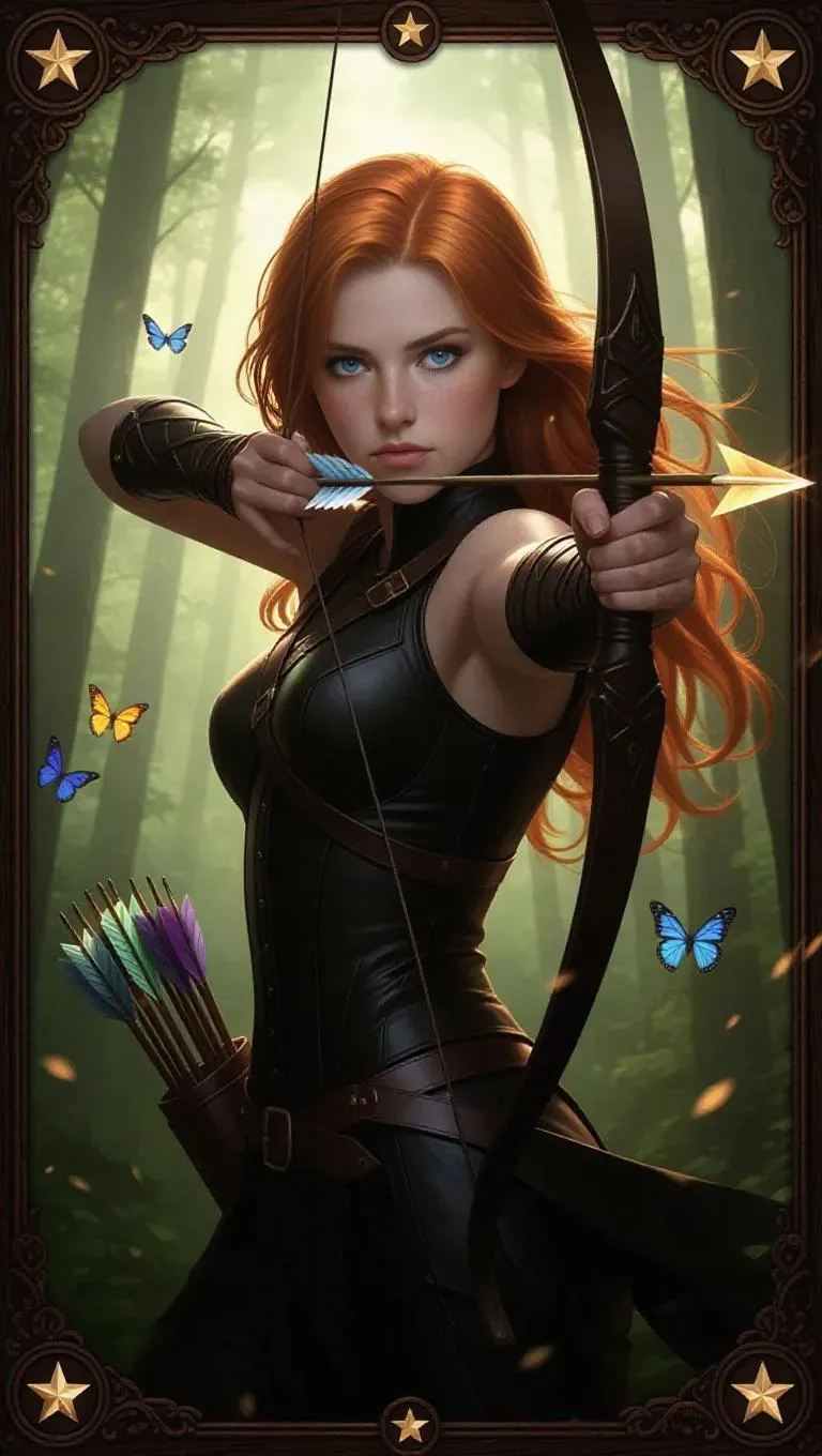 A youthful female archer with fiery red hair and sharp, focused blue eyes, clad in a sleek black outfit with a quiver of arrows and a powerful bow. She takes aim, and a magical arrow with a glowing tip is poised for release. The dense forest background features dappled sunlight and fluttering butterflies, framed by a rustic wooden border adorned with star patterns and hunting insignias, exuding a natural, earthy texture. Soft lighting, subtle glows, and a sense of adventure create a captivating collectible card game-style image.