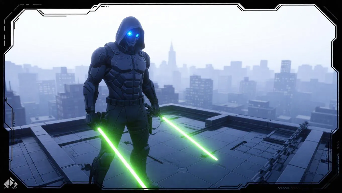 A cyberpunk assassin stands on a foggy rooftop, wearing a gray tactical suit and brandishing two energy swords. His blue cyber-eye scans the surroundings. The collectible card showcases a sleek black border with distortion effects, an uncommon-class icon, and green-yellow holographic lighting, lending intrigue to the synthwave theme.