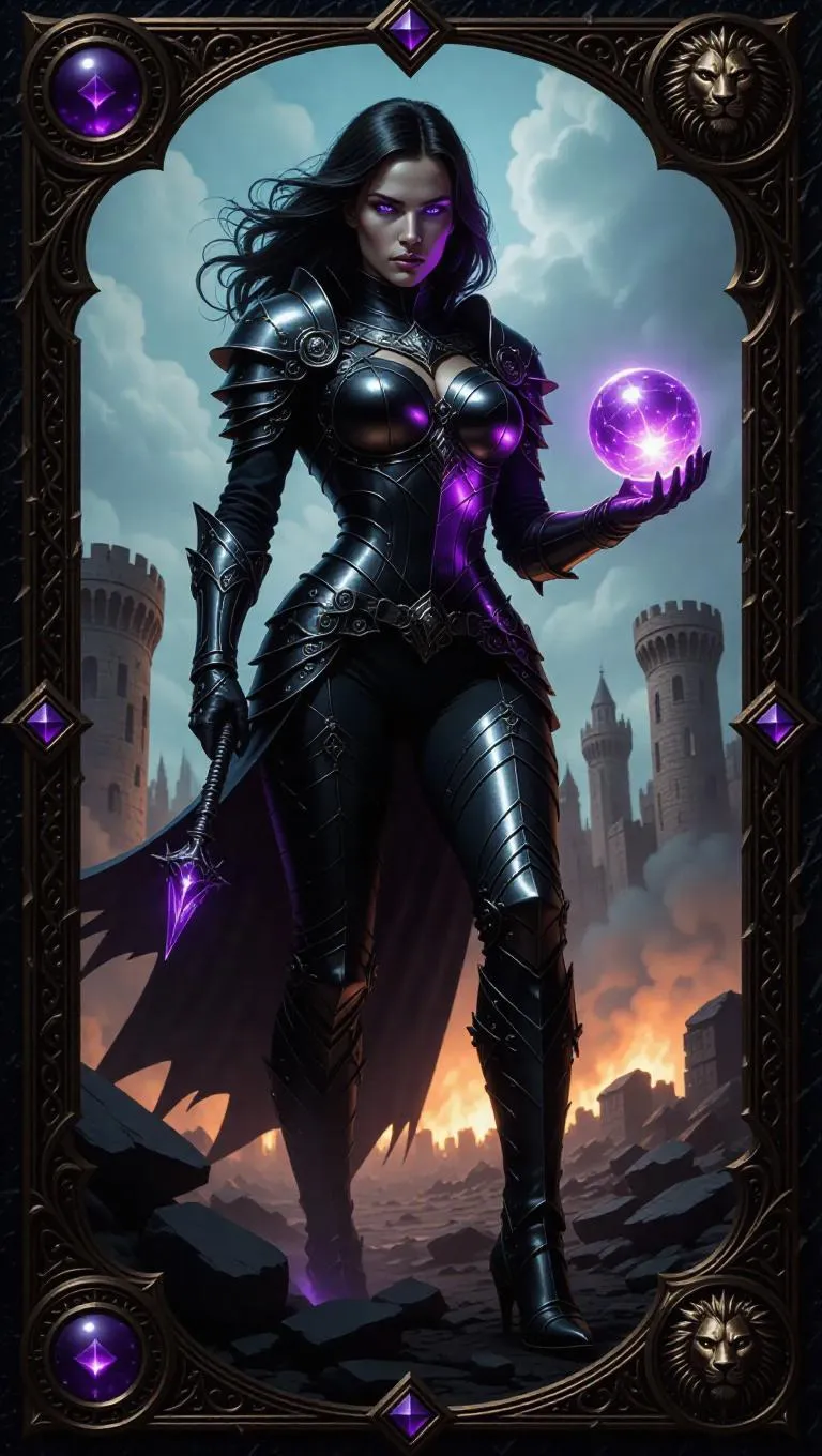 A formidable sorceress with piercing violet eyes, clad in a heavy armored bodysuit and steel boots, holds a glowing crystal orb while standing in a war-torn landscape. Crumbling fortresses and clouds of smoke create a gritty ambiance. The card border features lion and sword motifs, accented with metallic and dark colors, and adorned with sapphire.