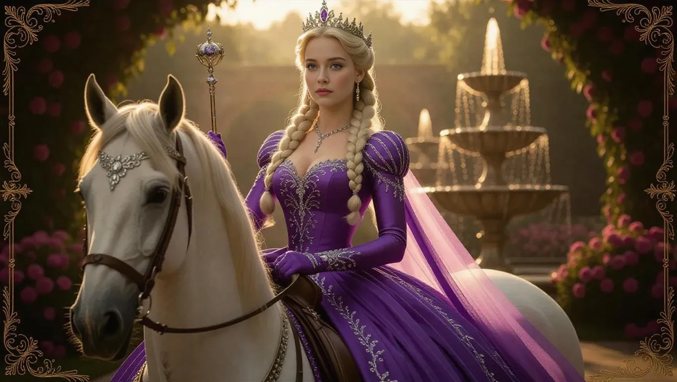 A noble female queen with elegantly braided blonde hair and regal purple eyes, wearing an exquisite gown with sparkling silver accents and a flowing train. She rides a graceful white horse, leading a procession with a scepter held high. The background features a lavish garden filled with blooming flowers and decorative fountains, bordered by a gold filigree frame adorned with royal symbols and elegant designs. Soft lighting, gentle shadows, and a regal, graceful ambiance create a breathtaking scene reminiscent of royal folklore.