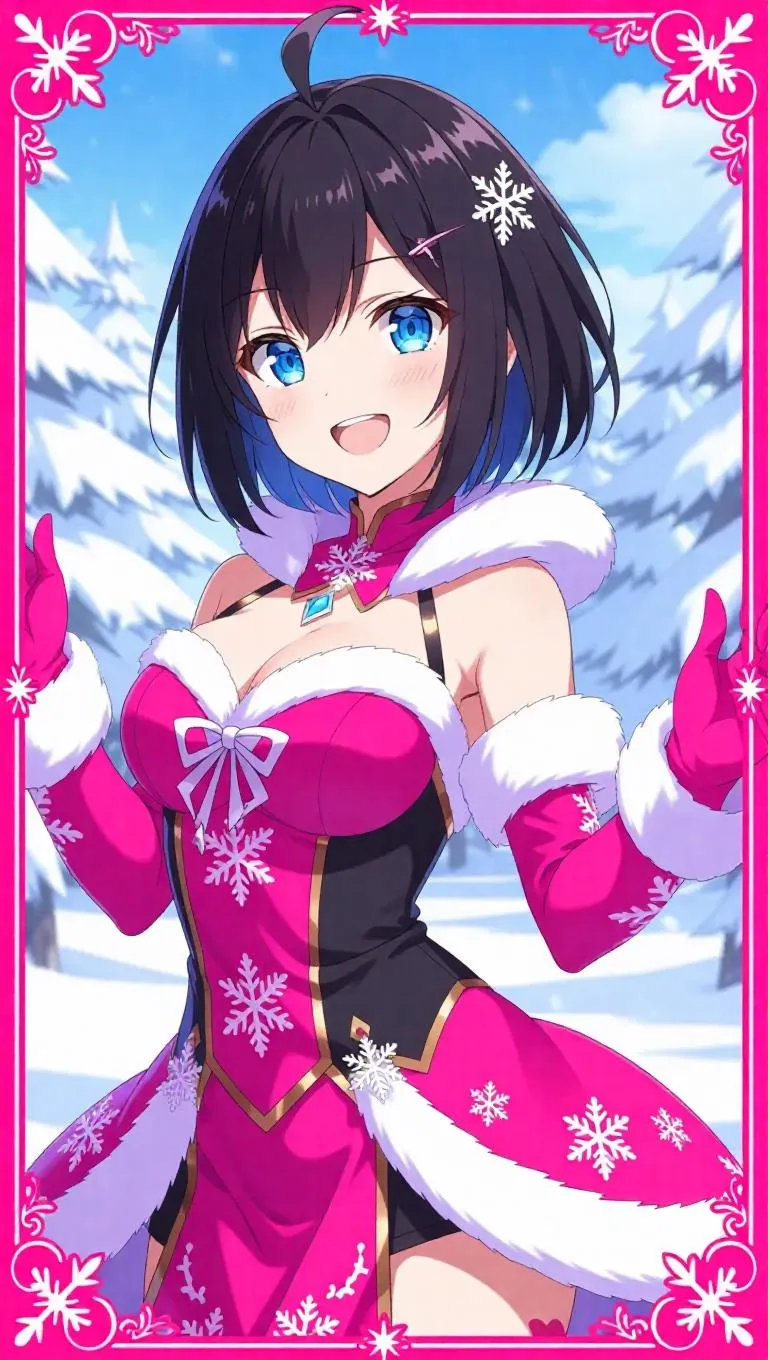 A lively anime-style female druid, adorned in a pink and white outfit with intricate snowflake patterns, stands in a cheerful pose. Her short black hair is entwined with tiny icicles, and her ice-blue eyes radiate cheer. The background showcases a winter wonderland with glistening snow. The scene is framed by an ornate pink border with snow motifs and a subtle sparkle.