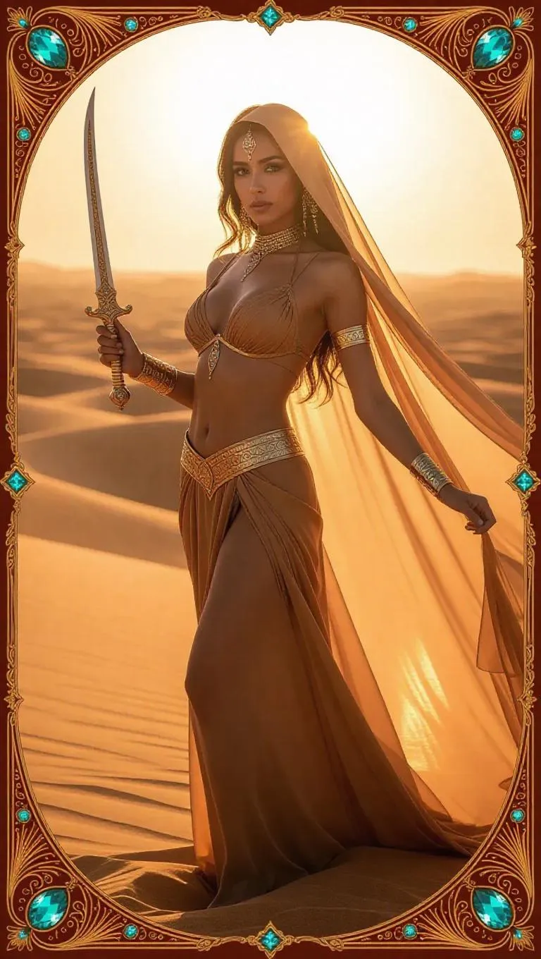 An exotic beauty with sun-kissed skin, wearing a flowing, translucent silk veil that billows in the desert wind, holding a golden scimitar while standing majestically on a sand dune. The background showcases a vast desert with a setting sun, casting a warm, golden glow. The card border integrates intricate palm tree and sun motifs, accented with gold and terracotta decorations, and adorned with shimmering topaz.