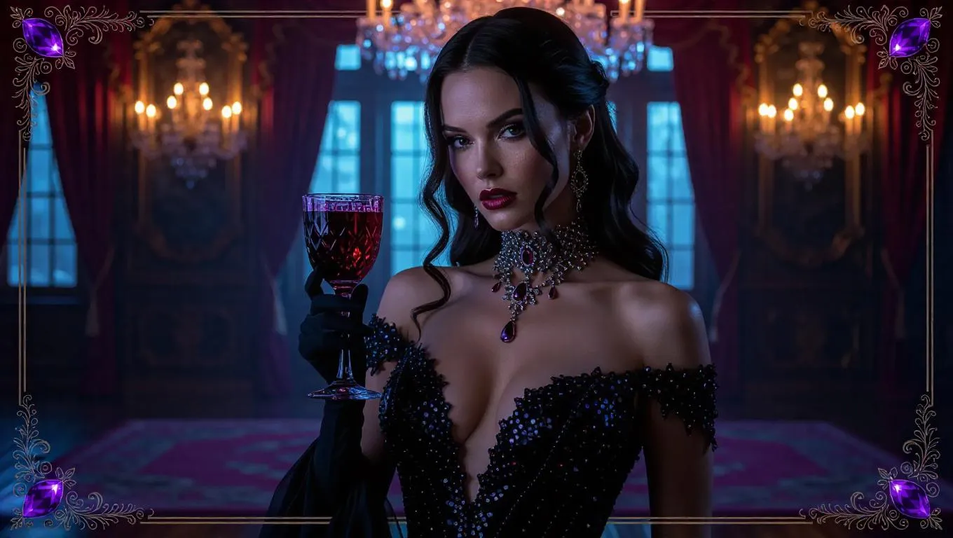 A seductive vampire with rosy pink lips, wearing a sequined black gown with a dramatic flare, holds a ruby-encrusted goblet of blood. Standing in a lavish ballroom decorated with chandeliers, surrounded by ornate mirrors and dancing light. The card border integrates serpent and sunflower motifs, accented with lilac and silver decorations, and adorned with radiant amethysts.