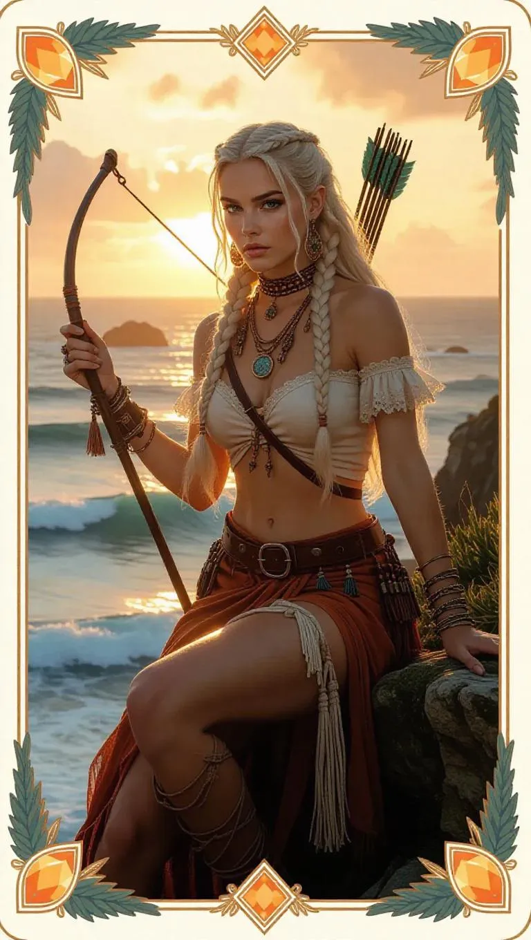 A fierce huntress with braided blonde hair, wearing a stylish boho outfit and adorned with tassels. She holds a slingshot, sitting atop a cliff overlooking the ocean. Rolling waves and a fiery sunset frame the scene. The card border includes coastal motifs and relaxed patterns, accented with soft coral and sky blue decorations, and adorned with bright citrines.