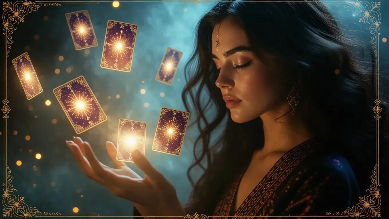 A mystical fortune teller with closed eyes in a deep trance, surrounded by floating, glowing tarot cards. She wears a flowing robe with intricate patterns, her hair cascading in loose waves. The tarot cards emit a soft, ethereal light, casting a gentle glow. The scene is enveloped in starry mist, set within an arcane gold-etched card frame adorned with sparkling cosmic particles, rare class border icons, and rainbow holographic effects. Soft, warm light enhances the mystical atmosphere, creating a serene and enchanting environment. Style: Magical realism.