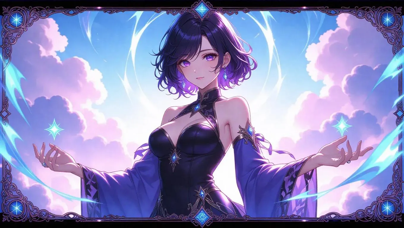 An impressive anime-style female character, adorned in a minimalistic outfit with flowing fabrics and elemental magic, stands in a graceful pose. She has medium-length curly purple hair and enchanting silver eyes. The dynamic background features swirling clouds and cascading light, surrounded by divine effects. The scene is framed by a copper border with ethereal card lettering and motifs, featuring a soft holographic texture. The image is ultra-detailed, highly polished, and vibrant, with soft lighting, glows, and pastel shine, illustrating a masterpiece in the style of collectible card games.