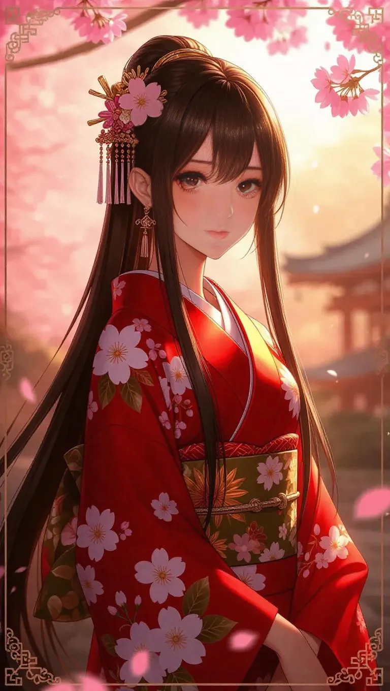 A stunning anime-style female character, adorned in a traditional kimono with floral designs and cultural accessories, stands in a serene pose. She has long straight brown hair and gentle hazel eyes. The dynamic background features cherry blossoms and soft sunlight, surrounded by tranquil effects. The scene is framed by a delicate border with traditional card lettering and motifs, featuring a soft holographic texture. The image is ultra-detailed, highly polished, and vibrant, with warm lighting, glimmers, and nature's shine, illustrating a masterpiece in the style of collectible card games.