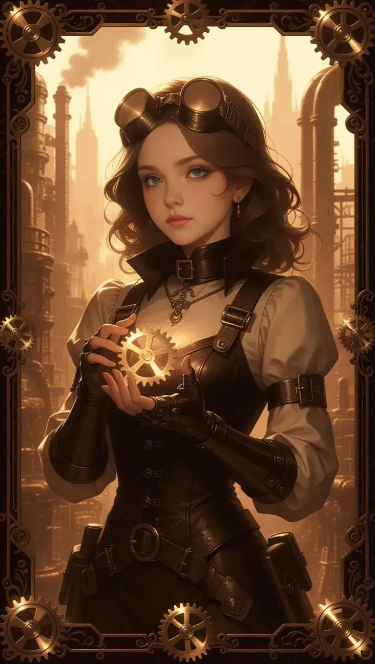 A steampunk inventor girl with a mechanical arm and flying goggles holds a glowing gear-powered device. She stands in front of a cityscape filled with pipes and steam towers. The scene is framed with brass-themed borders and gear emblems, bathed in a sepia-toned shine. Detailed mechanical textures and vintage collectible game card design elements enhance the retro-futuristic atmosphere. Soft, warm side light highlights her determined expression and the intricate gears, creating a nostalgic yet futuristic feel.