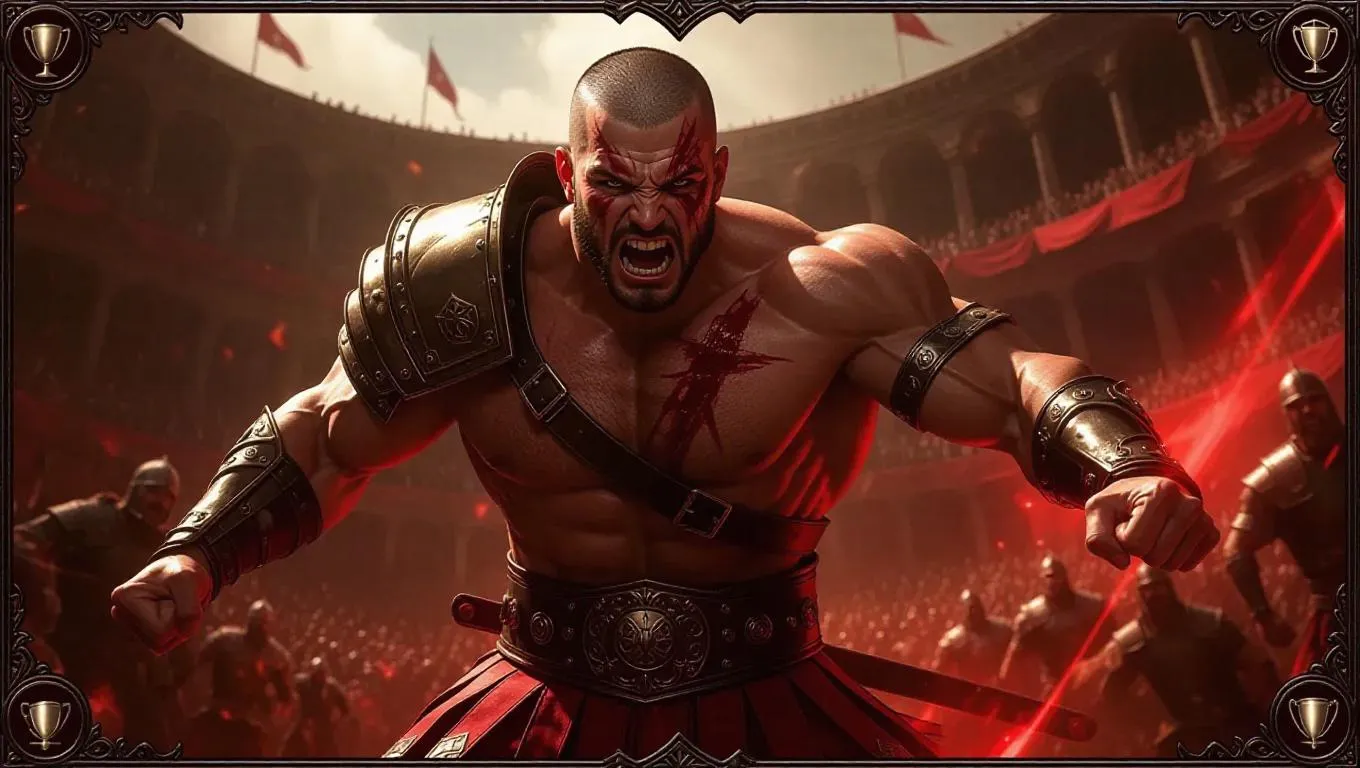 A fierce gladiator with shaved brown hair and a red aura charges through dark energy. His battle scars show as energy crowds around him. The scene is set against a vast arena, with roaring crowds in the background. The card is framed with rugged silver borders, adorned with trophy icons and gladiator emblem stickers, creating a high-quality SSR gladiator card effect. The lighting is dynamic and intense, casting strong shadows and highlighting the brutal action. The style is a mix of ancient history and epic battles.