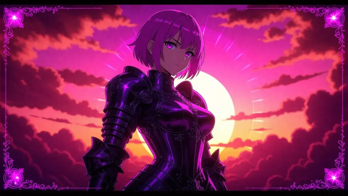 A fierce anime-style female knight, clad in armored plating with intricate engravings, stands in a majestic pose. Her cropped pink hair is stylishly cut, and her lilac eyes gleam with determination. The background features a sunset sun casting pink rays, surrounded by dramatic clouds. The card border is radiant, with abstract patterns, elemental symbols, and a holographic finish, accented by pink vines and glimmering opals.