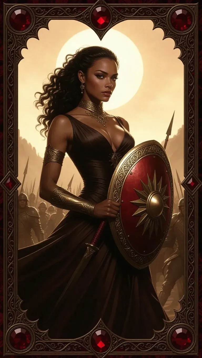 An exotic beauty with dark skin, wearing a tailored, elegant dress that rustles in the gale, holding an ornate shield while standing heroically on a battlefield. The background showcases a war-torn landscape with a pale sun overhead, casting a somber, reflective glow. The card border integrates intricate sword and sun motifs, accented with crimson and pewter decorations, and adorned with gleaming garnet.