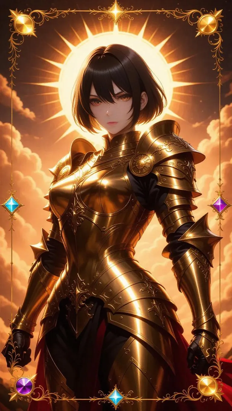 A fierce anime-style female knight, clad in golden armor with intricate engravings, stands in a commanding pose. Her short black hair is tied back, and her amber eyes gleam with determination. The background features a rising sun casting golden rays, surrounded by glowing clouds. The card border is radiant, with sunburst patterns, celestial symbols, and a holographic finish, accented by golden vines and shimmering gemstones.
