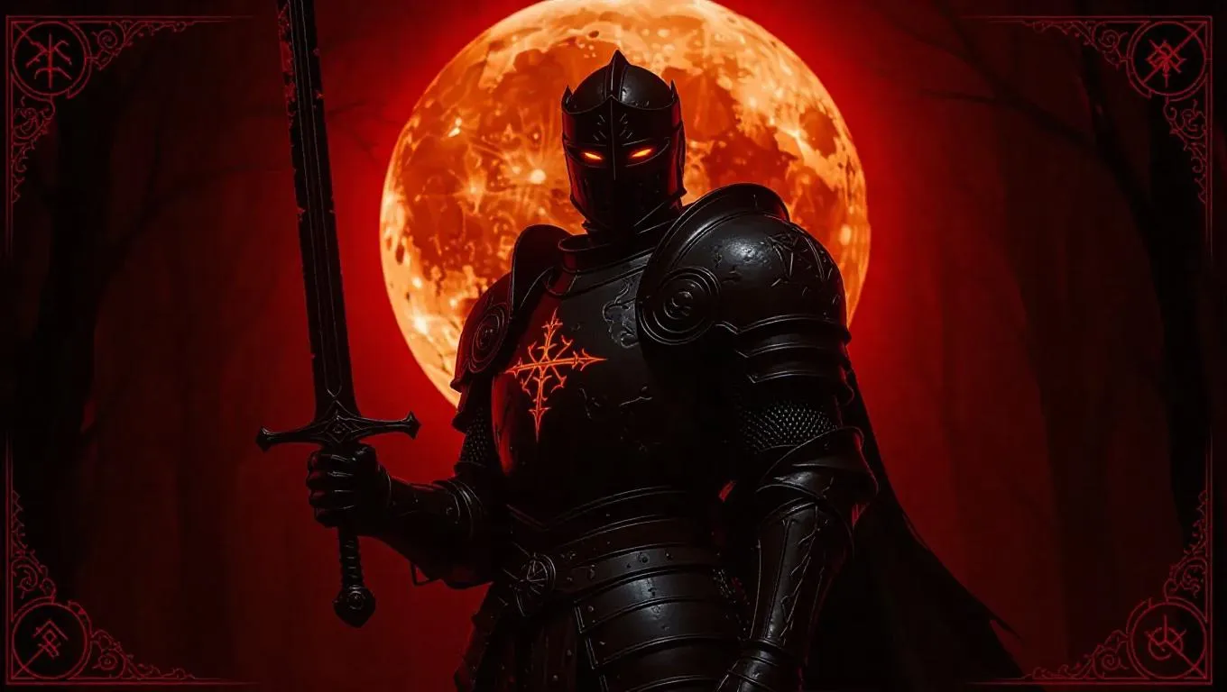 A corrupted knight stands under a blood moon, his ancient armor and cursed black sword reflecting the eerie glow. His single glowing orange eye pierces the darkness. The game card border features intricate runic shapes, dark forest tones, blood runes, and a legendary time-element mark with flickering glowing effects. Side light casts eerie shadows, enhancing the knight's haunting presence. Style: Dark fantasy.