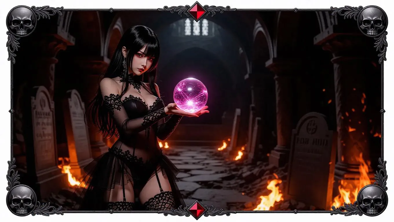 A dark sorceress with intense red eyes, wearing a sheer black dress and thigh-high stockings, holds a glowing crystal orb while standing in a dimly lit crypt. Broken tombstones and flickering flames create a sinister ambiance. The card border features skull and scythe motifs, accented with gray and red decorations, and adorned with onyx.