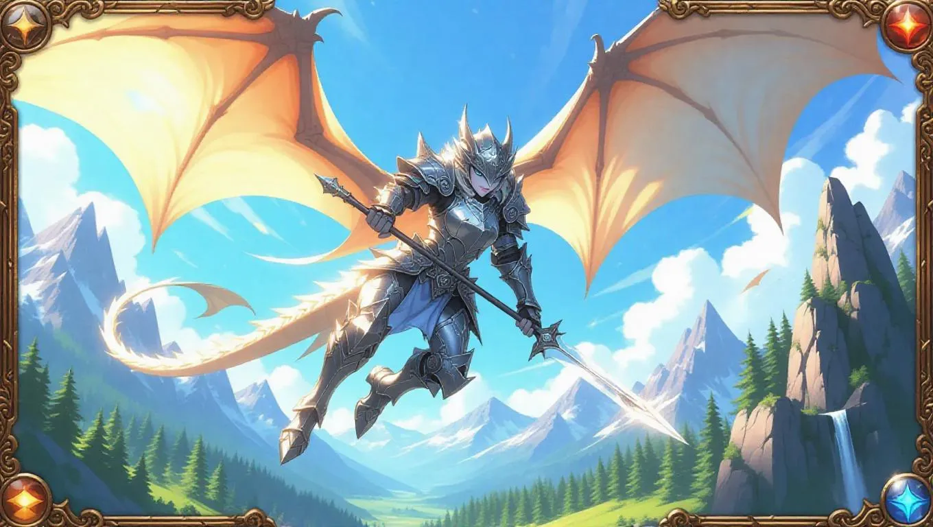 A valiant dragon knight swoops down from the mountains, wings partially folded, and a lance shimmering with elemental power. Her silver armor glistens under the sun, and the background depicts a rugged terrain. The game card features a fantasy-themed border with engraved symbols, bronze foil textures, and a bright fiery glow.
