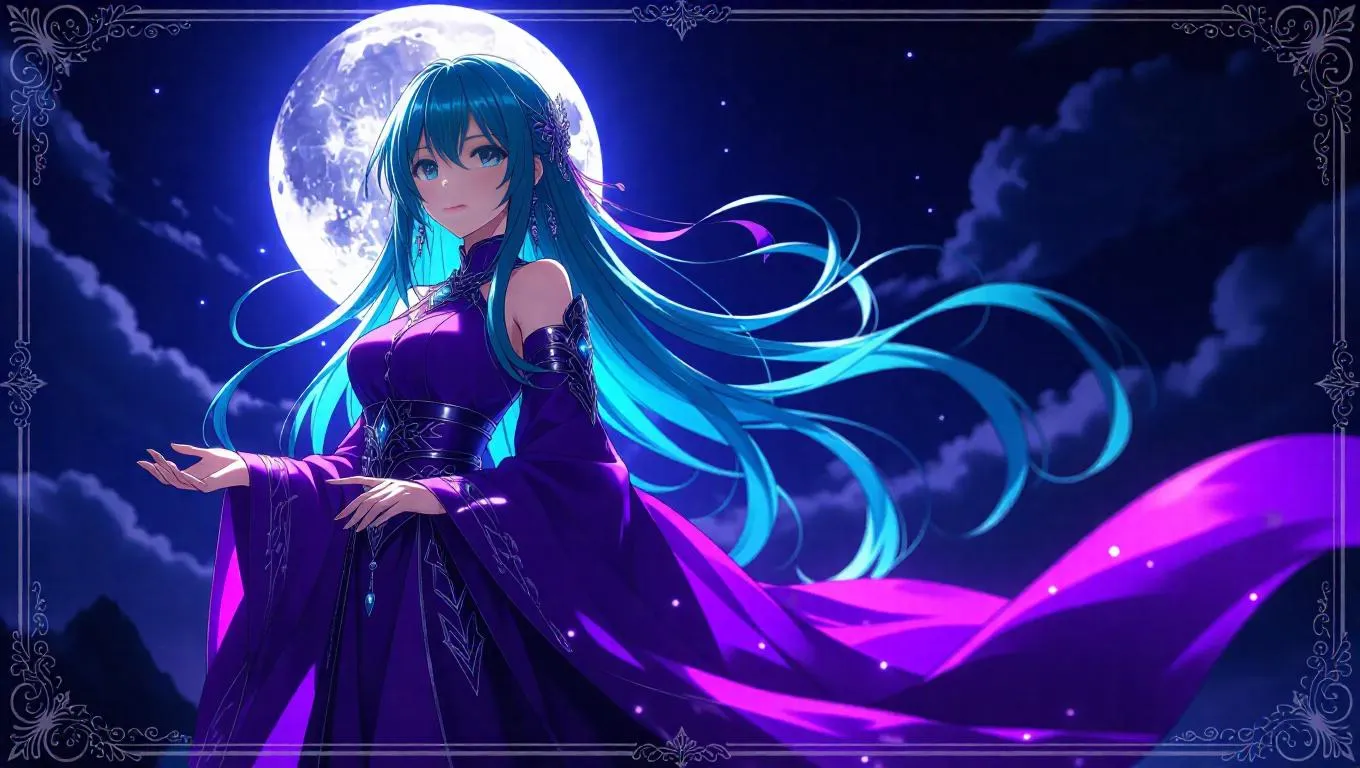 A serene anime-style female guardian, adorned in flowing purple robes with silver highlights, stands in a graceful pose. Her long teal hair shines with an otherworldly glow, and her deep blue eyes project peace. The background features a moonlit night sky with bright stars. The scene is framed by an intricate platinum border with cosmic elements and a mystical shimmer.