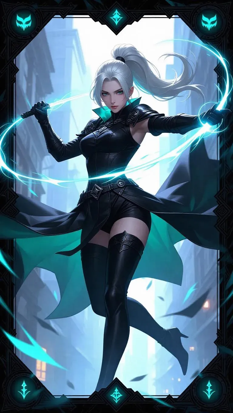 A swift rogue with a sleek silver ponytail and a teal aura darts through dark energy. Her stealth cloak flutters swiftly as energy blades slice around her. The scene is set against a foggy night, with shadows dancing in the background. The card is framed with shadowy gray borders, adorned with dagger icons and stealthy mask emblems, creating a high-quality SSR rogue card effect. The lighting is dim and secretive, casting soft shadows and highlighting the stealthy action. The style is a blend of noir and urban fantasy aesthetics.