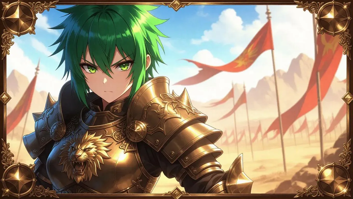 A fierce anime-style female monk, clad in an armored robe with lion symbolism, stands in a battle-ready pose. Her spiky green hair shines fiercely, and her vibrant gold eyes radiate valor. The war-torn battlefield background is adorned with banners. The card border is powerful, featuring shield and sword designs, embossed Latin characters, matte finish, citrine stones, and bronze filigree.