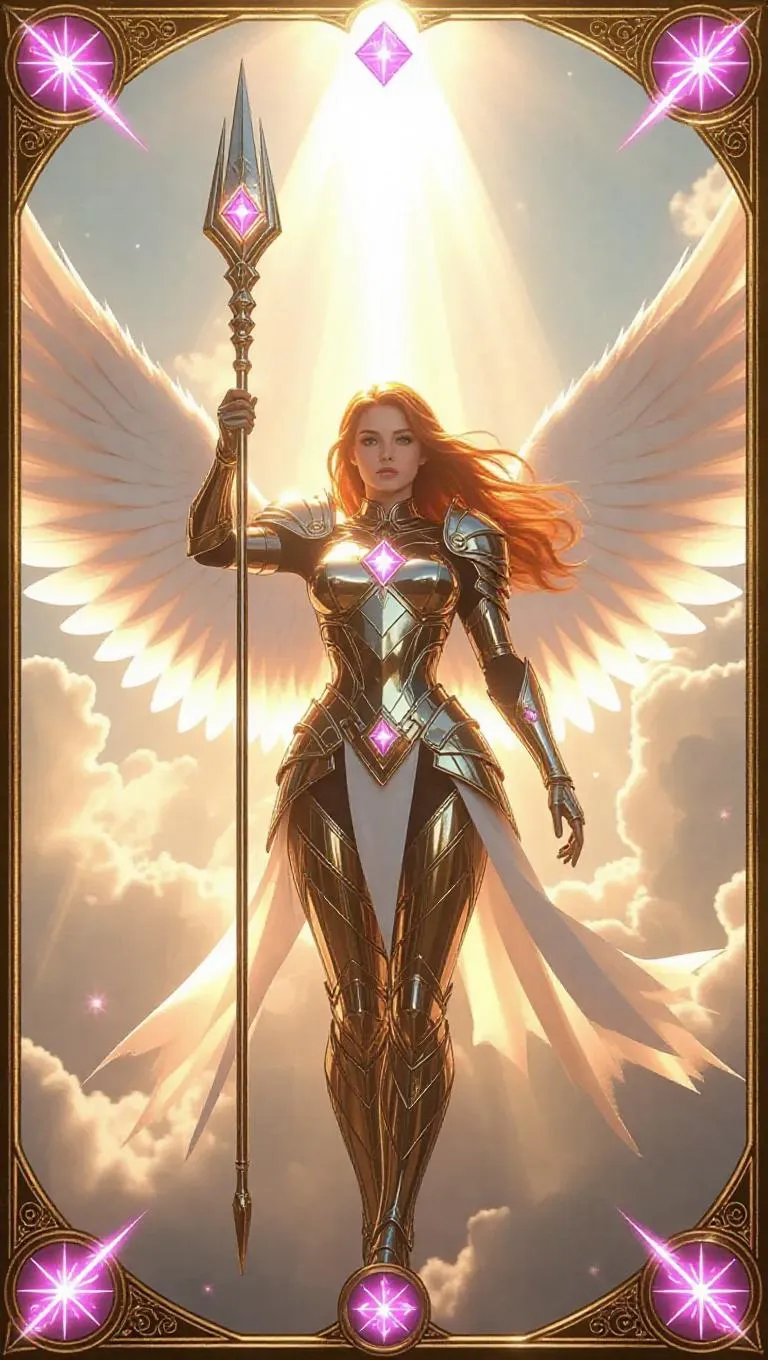 A heroic auburn-haired battle angel, clad in reflective diamond armor and adorned with glimmering wings, holds a divine javelin aloft. Sunlight beams and high-altitude clouds fill the background, creating an uplifting atmosphere. The card is bordered with holy glyphs, featuring sparkling effects and pink holographics, enhancing the sacred aura.