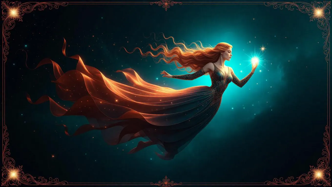A celestial sorceress floats in space, her long copper hair blending seamlessly with the cosmos. She wears a dress woven from cosmic threads, casting radiant star spells from her fingertips. The background features glimmering stars, while the card is framed with a rose-gold border adorned with soft glows and glistening textures. Soft, turquoise light illuminates her from the back, creating a gentle contrast with the dark, star-studded backdrop. The style is whimsical and fantastical, blending realism with magical elements.