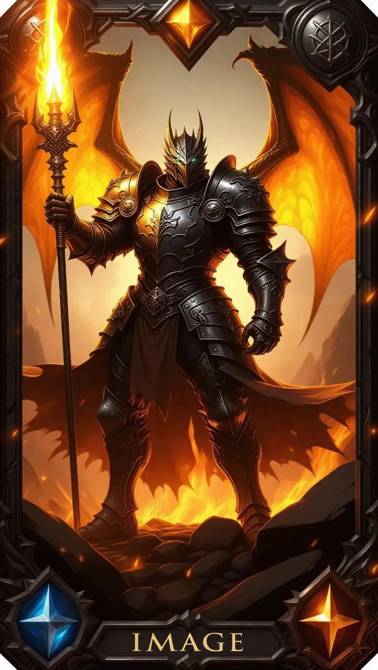 A heroic dragon knight in battered armor wields a flaming lance, standing defiantly on a blackened battlefield with embers swirling high. The knight's commanding expression and sturdy body convey his valor. His armor, detailed with historic emblems, reflects the fiery glow. The scene is drenched in amber, flickering light, casting bold shadows. The card features a silver-grey holographic frame with powerful sigils and a polished metallic appearance, styled as a rare legacy-element legendary card.